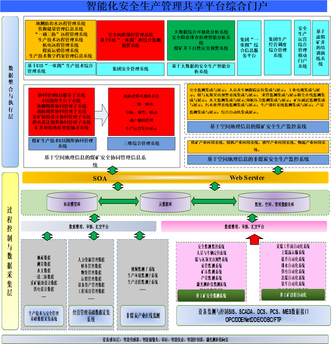 “智能化安全生產(chǎn)管理平臺(tái)”作為一個(gè)以業(yè)務(wù)為中心的系統(tǒng)框架,使得生產(chǎn)業(yè)務(wù)及管理部門“看得到、管得著、控得住”,提升各部門間的橫向整合以及各級(jí)管理部門間的縱向集成。總體架構(gòu)設(shè)計(jì)有三層重要含義: