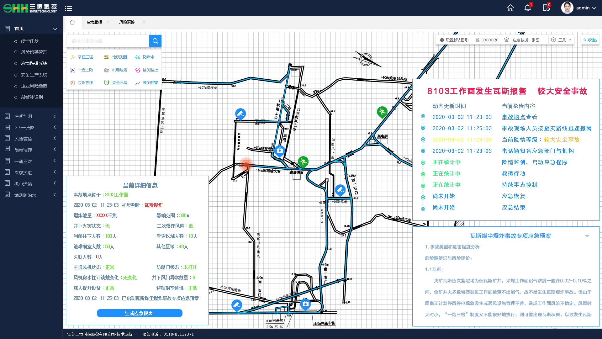 系統(tǒng)能夠在煤礦發(fā)生事故時(shí),彈出相關(guān)報(bào)警信息,并同時(shí)顯示事故區(qū)域環(huán)境和人員情況,啟動(dòng)應(yīng)急預(yù)案,按照預(yù)案彈出應(yīng)急機(jī)構(gòu)、專家和隊(duì)伍通訊錄,避災(zāi)路線圖,并方便地調(diào)出相關(guān)各類圖紙資料,同時(shí)集成各類通信手段(調(diào)度電話、工業(yè)視頻、短信和記錄工具等),為應(yīng)急救援提供支持,滿足應(yīng)急救援指揮的需要。